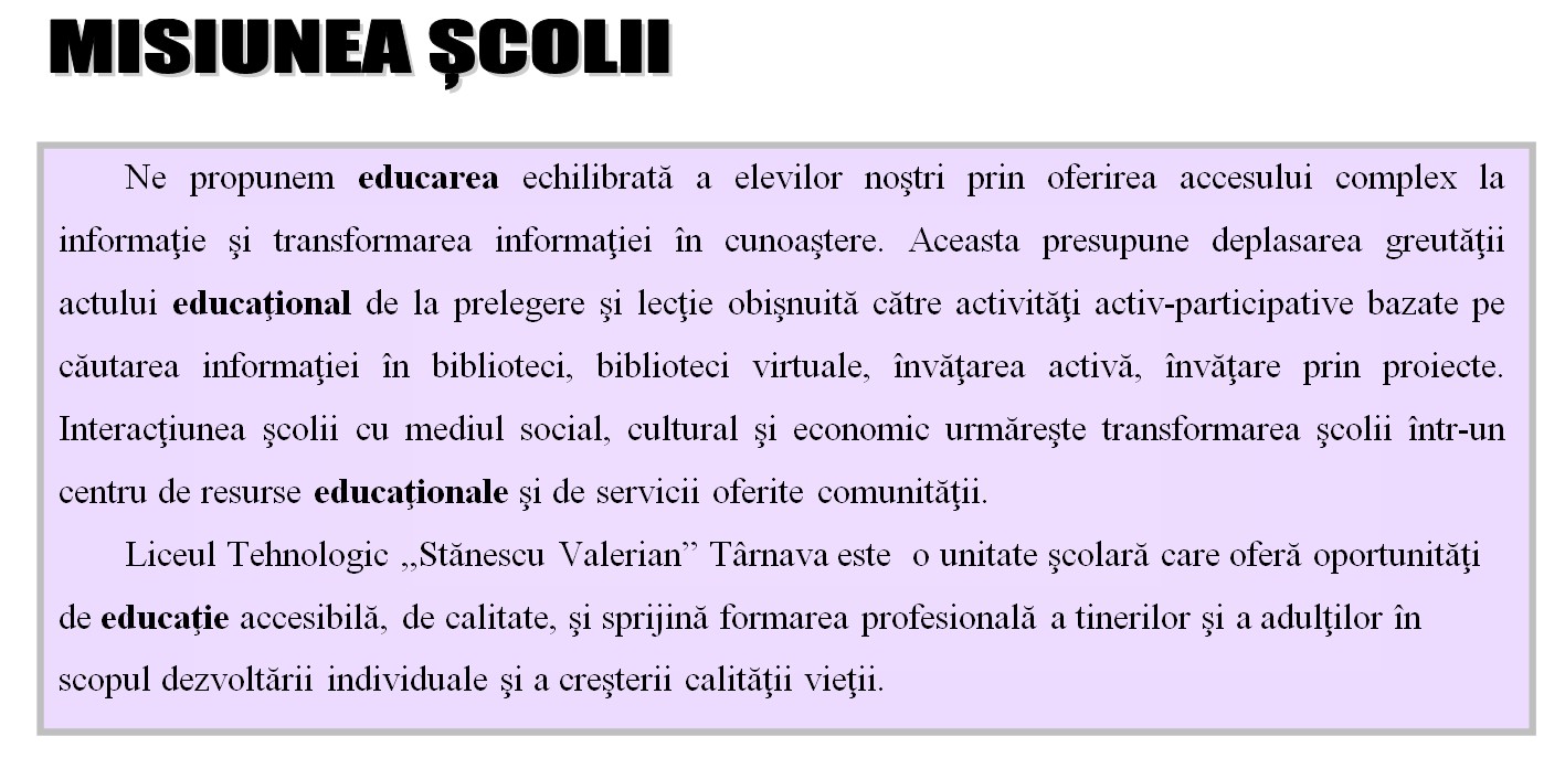 Relații suplimentare la sediul LICEULUI TEHNOLOGIC STĂNESCU VALERIAN, cu sediul în oraș/ comună /sat TÂRNAVA, str. MĂRULUI, nr. 2, județul SIBIU, persoană de contact: POP CORBEA-IOAN telefon +40269858145 int.201, fax . +40269858145